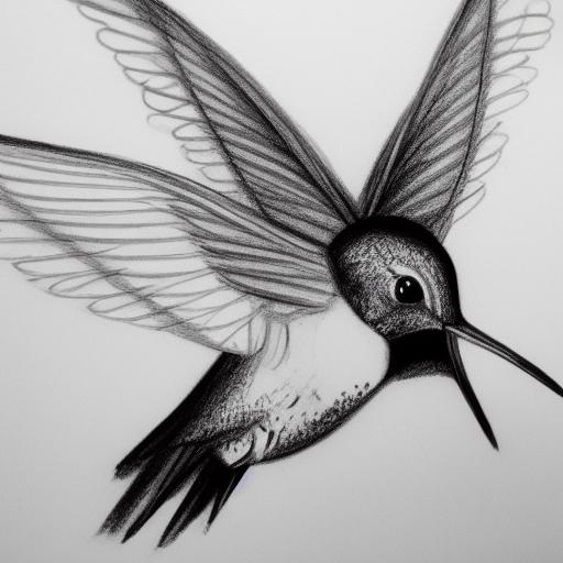 A black and white drawing of a flying hummingbird