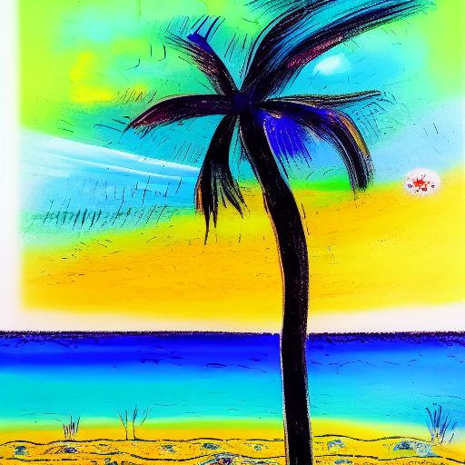 A color painting of a palm tree on a beach side