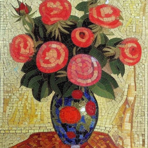 Firstly, the prompt specifies that the image should be a mosaic of roses in a vase. This means that the image will consist of small, colored tiles arranged in a pattern to create a larger image. The type of flowers that are depicted is also specified, as well as the fact that they are in a vase. This helps to narrow down the possible variations of the image.