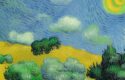 The prompt begins by describing the subject matter of the painting, a wheatfield with cypress trees and a blue sky. This information provides the AI with a clear idea of what to include in the image it generates. The AI can use this information to create a similar composition with wheat fields, cypress trees, and a blue sky.