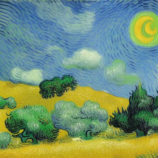 The prompt begins by describing the subject matter of the painting, a wheatfield with cypress trees and a blue sky. This information provides the AI with a clear idea of what to include in the image it generates. The AI can use this information to create a similar composition with wheat fields, cypress trees, and a blue sky.
