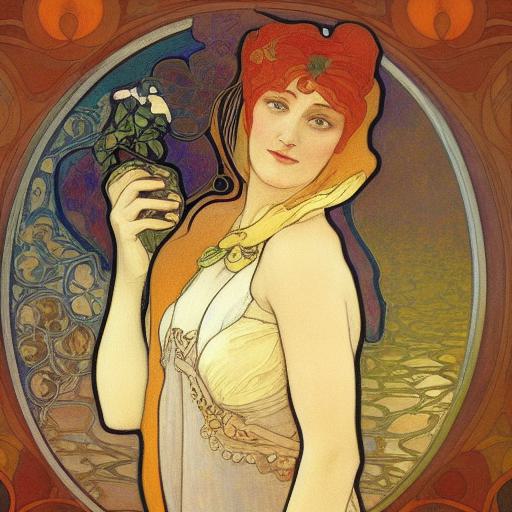 By incorporating these elements into the prompt, the AI image generator is directed to create an art nouveau-inspired painting featuring a woman holding a bottle. The resulting artwork will likely showcase the flowing lines, decorative details, and elegant composition characteristic of Alphonse Mucha’s style, while also incorporating influences from the Pre-Raphaelite movement.