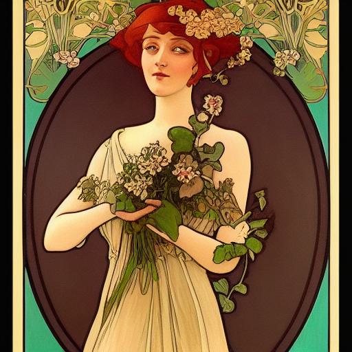 • Art Nouveau painting inspired by Alphonse Mucha: This indicates the artistic style and inspiration for the painting. Art Nouveau is characterized by elegant, flowing lines, intricate details, and organic forms. Alphonse Mucha, a prominent Art Nouveau artist, is known for his distinct style that often featured graceful women and botanical motifs.
