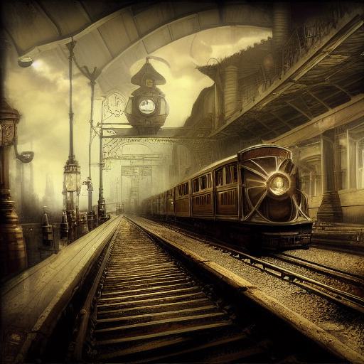 The mention of a “steampunk train” evokes a sense of adventure and technology fused with the aesthetics of the Victorian era. The train traveling through a station creates a dynamic scene, suggesting movement and a bustling atmosphere.