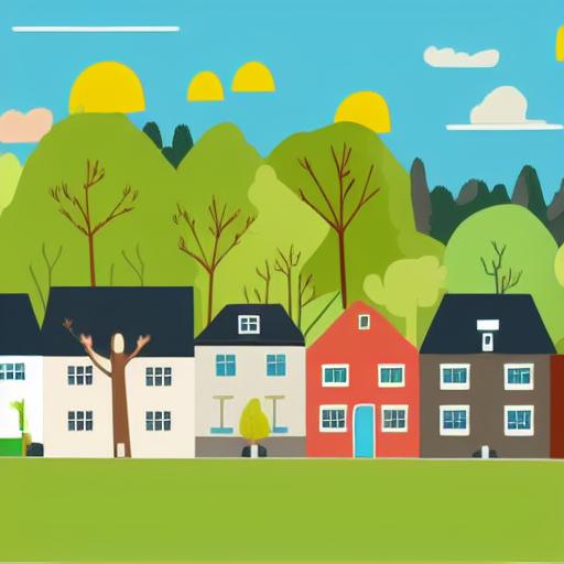 An illustration of a town with houses and trees in the background
