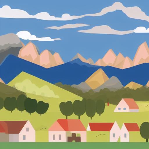 An illustration of a town with mountains in the background