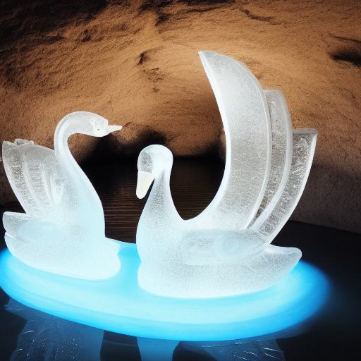 An tranquil ice sculpture of two glowing ice-made swans on a wave