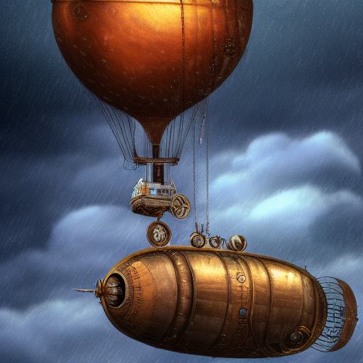 Detail steampunk art of a mechanical airship flying in the thunderstorm and raining