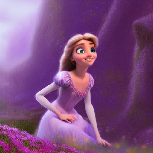 - Character Description: “Rapunzel with Flowers in Her Hair” – This specifies the main character in the image, Rapunzel, and provides a visual detail of her having flowers in her hair. This detail adds a touch of whimsy and femininity to the image, while also hinting at her connection to nature.