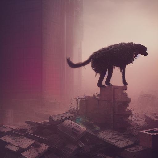 - The artwork is dystopian art, featuring a dog standing on top of a pile of rubble.