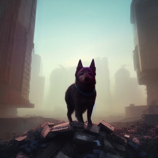 7. “In a post-apocalyptic city” – This sets the scene for the image and provides context for the dog standing on a pile of rubble. It suggests a world that has suffered some kind of catastrophic event.