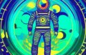 The space suit is often used in psychedelic art as a symbol of exploration, discovery, and the unknown. It represents a boundary between the familiar and the unfamiliar, and suggests that the wearer is embarking on a journey of discovery or transformation. The space suit can also be seen as a protective barrier, separating the wearer from potentially dangerous or hostile environments, and symbolizing a sense of safety and security in the midst of uncertainty.