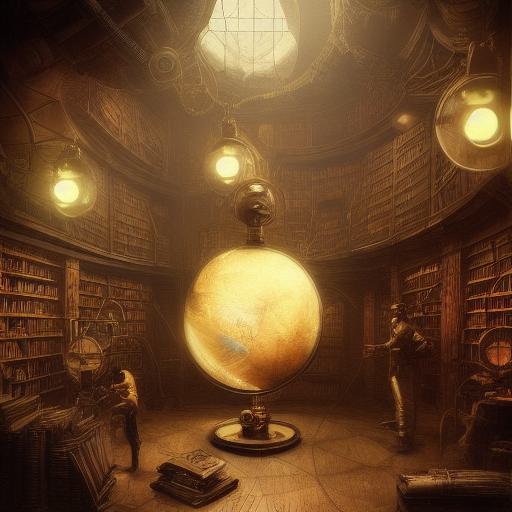 - “A mechanical glowing globe in a library” – This provides a specific object and setting for the image. It also gives the image a sense of time and place, suggesting a steampunk-inspired library.