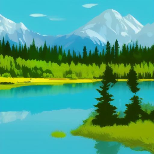 Mountain landscape with pine trees and lake in the foreground