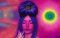 - The woman is the main subject of the image, with a flower in her hair and a psychedelic appearance.