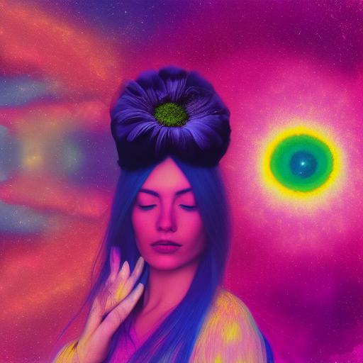 - The woman is the main subject of the image, with a flower in her hair and a psychedelic appearance.