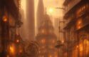 - Golden steampunk city atmosphere: The mention of a golden atmosphere sets a warm and radiant tone. It implies a city bathed in the glow of sunset, casting a golden hue over the buildings and creating a visually striking ambiance.