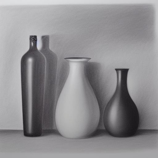 The black and white charcoal drawing of two vases and a bottle