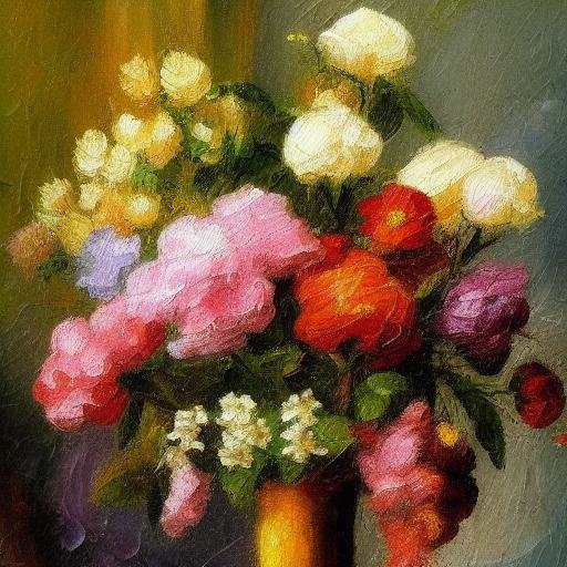 The painting of several flowers in a vase
