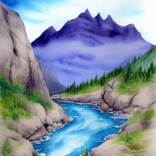 A fantasy detailed watercolor painting of a river with a mountain and rocks in the background