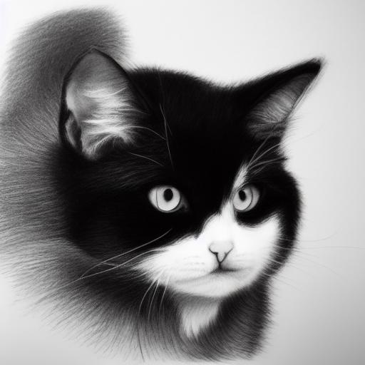 A black and white drawing of a fluffy cat