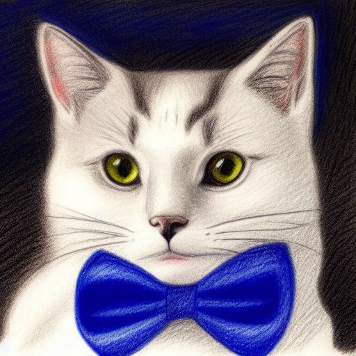 A crayon drawing of a close up cat wearing a tiny blue bow tie