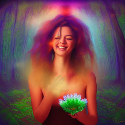 A digital 2D fantasy psychedelic artwork painting of a woman holding a laughing flower