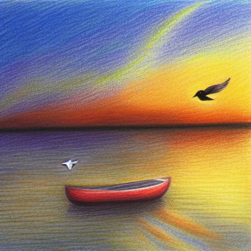 Overall, this prompt provides a clear direction and specific details for the AI to follow, resulting in an image that includes a sunset scene with a bird and a boat, created in the style of Jitish Kallat’s color pencil sketches and incorporating elements of pastel art and realism.