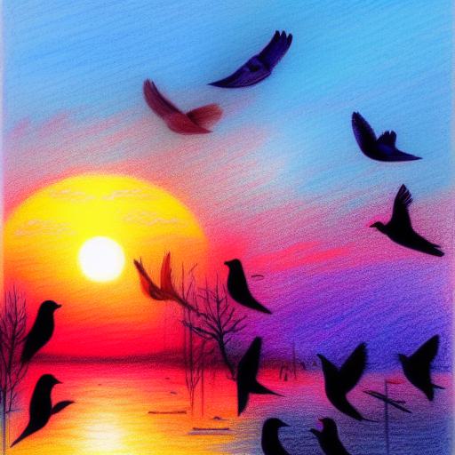 A drawing of a sunset with a some birds