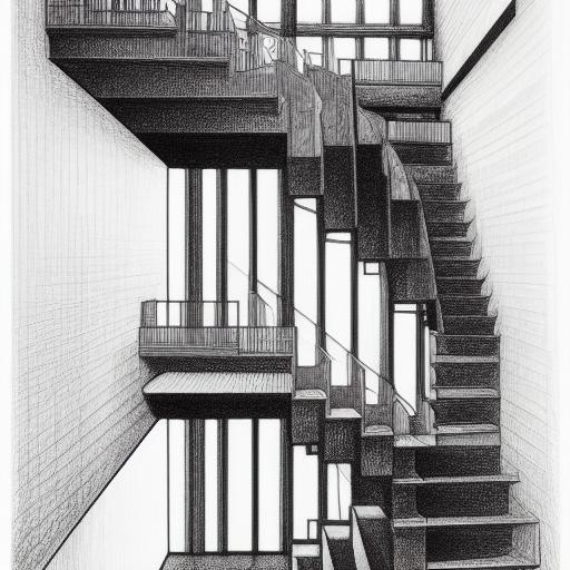 The first part of the prompt is “a drawing of lots of staircases in a building.” This sets the primary subject matter of the image: a building with a complex network of staircases. The word “lots” implies that there are many staircases, which suggests a level of complexity and intricacy to the image.