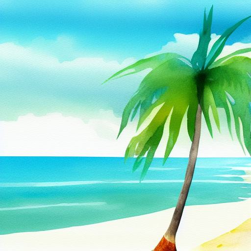 A painting of a beach with one palm tree