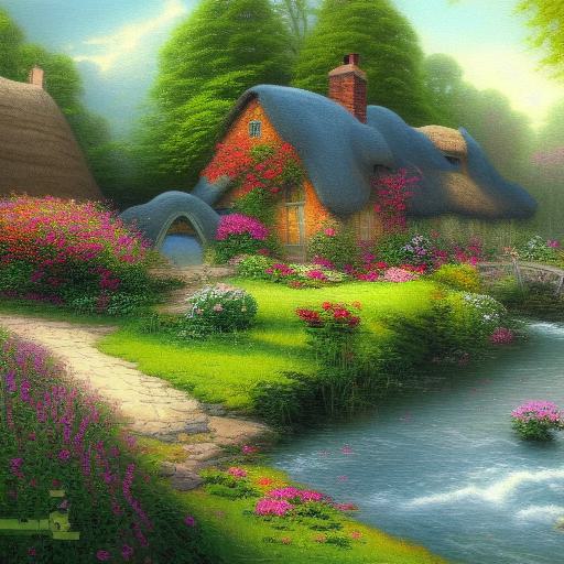 A painting of a cottage by a river with flowers