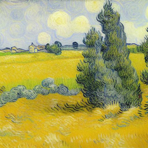 A painting of a wheatfield with cypress trees
