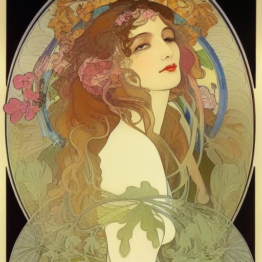 Art Nouveau is a popular art movement known for its elegant and decorative style. Alphonse Mucha is one of the most famous artists associated with the Art Nouveau movement. His art is characterized by its sinuous lines, stylized floral motifs, and elegant figures. Let’ see how the prompt generate an image based on his style.