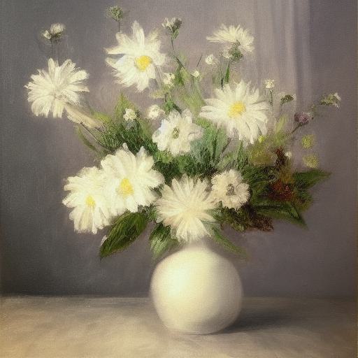 A painting of beautiful white flowers in a vase on a table