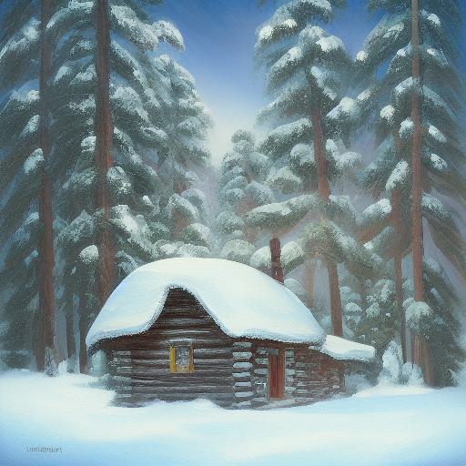 A painting of one cabin in a snowy forest
