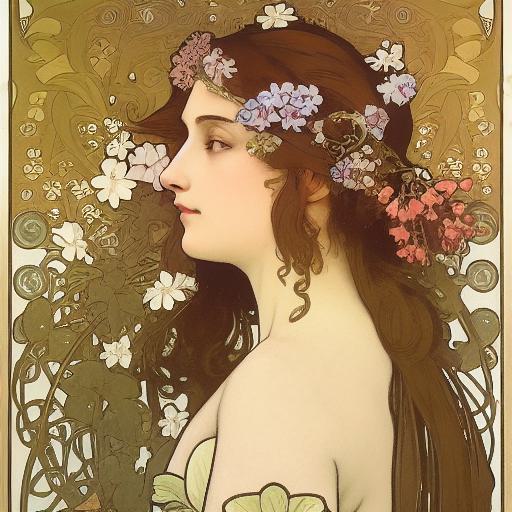 The prompt specifies that the painting is inspired by Alphonse Mucha, a renowned figure of the art nouveau movement. This reference provides a stylistic foundation, characterized by intricate ornamentation, flowing lines, and a harmonious integration of nature and the female form.