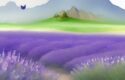 About A serene watercolor painting of a field of lavender and butterfly with a mountain in the background
