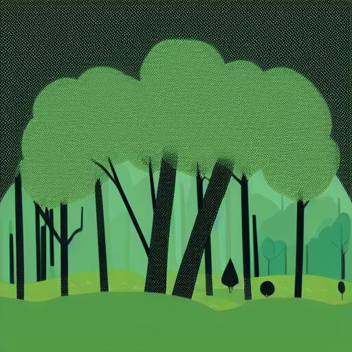 Green and black landscape with trees and houses