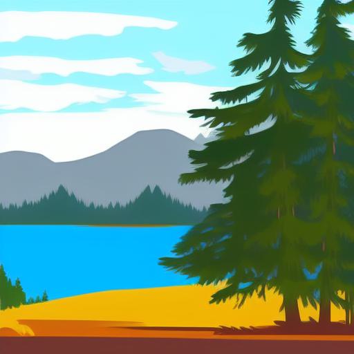 Mountain landscape with pine trees and lake in the foreground