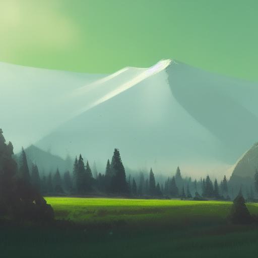 Snowing day with dim sunlight a painting of a green field with snow mountains in the background
