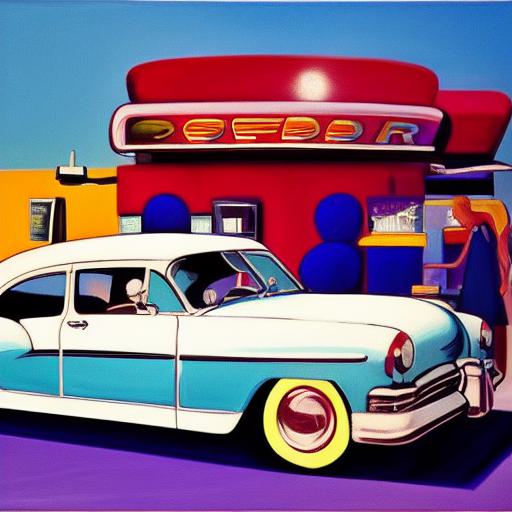 The painting of a car parked in front of a restaurant