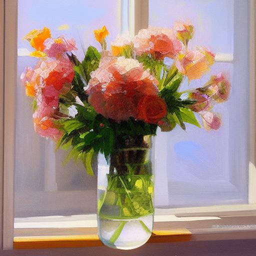 The painting of some flowers in a vase on a window sill