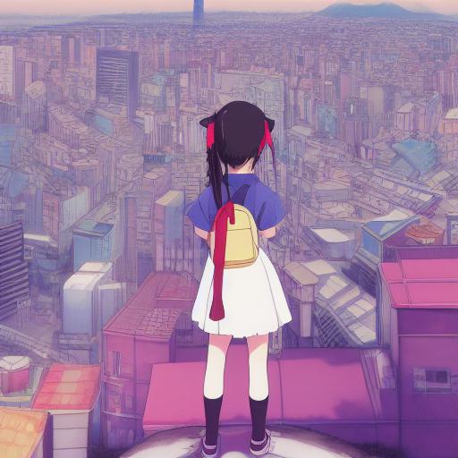 2. School girl in front of vibrant Tokyo cityscape: This provides the subject matter for the image, and suggests that it will be set in a bustling urban environment.