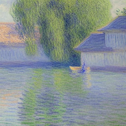 A painting of a building next to a body of water