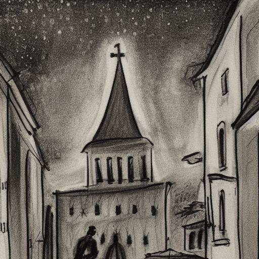 A black and white drawing of a city and church at night with starry sky