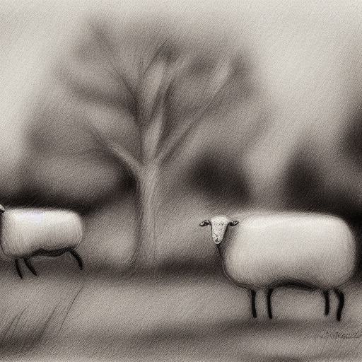 A black and white drawing of sheep and few trees with small house