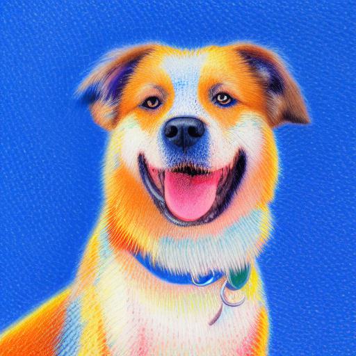 A close up of a painting of a smiling dog with blue background