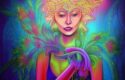 About A digital 2D fantasy psychedelic artwork painting of a woman holding a laughing flower