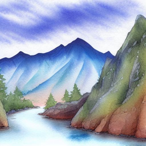 A fantasy detailed watercolor painting of a river with a snowy mountain and rocks in the background